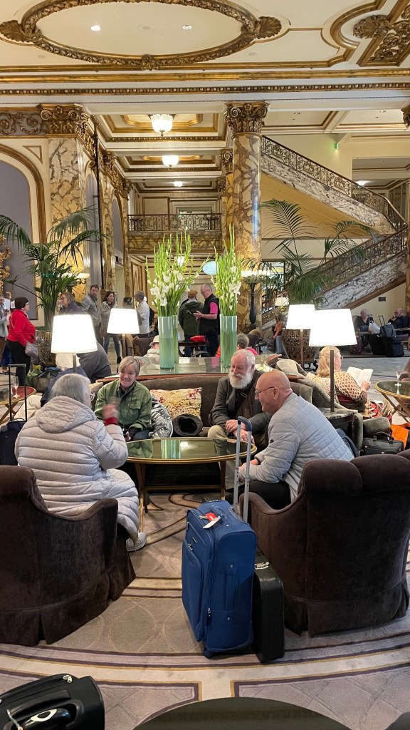 Once we reached fly-away day in one piece and then dodged storm and flood to arrive at our San Francisco departure city with a day to spare, then overcame Oceania Cruises’ accidental cancellation of all our hotel and ground arrangements, and boarded Insignia to find all our luggage at our stateroom door, we figured we were beyond worry. (At the well-organized Oceania Cruises desk in the lobby of San Francisco’s Fairmont Hotel, we were told we didn’t exist. The happy faces in the photo below? Those were passengers who did exist.)