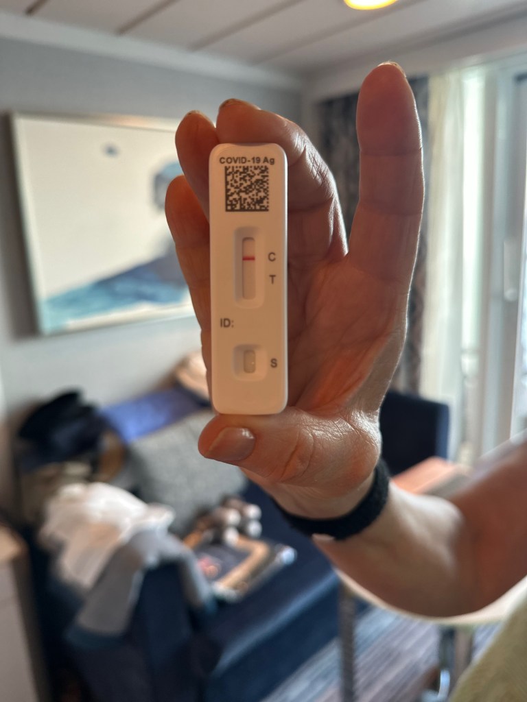 The announcement came, literally, as Doris was typing the words above. It was an advisory that the ship’s officers and crew had resumed wearing N95 face masks to meet a new benchmark for safety whenever covid is detected on board. Vaccinated passengers had not been required to test for the virus before embarking. In lieu of universal testing, Oceania Cruises had now decided to lower the threshold for masking employees from 0.5 percent of the ship’s occupants having covid or close contact with a case to 0.3 percent.