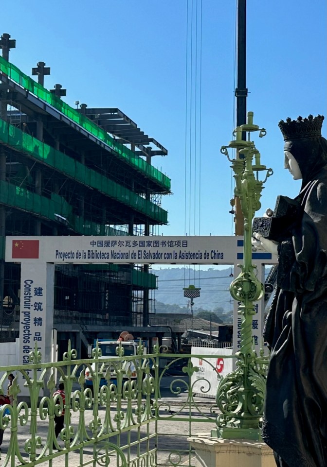 (Below: also looming at the National Palace in San Salvador are signs of of the latest wave of foreign opportunists in Central America)