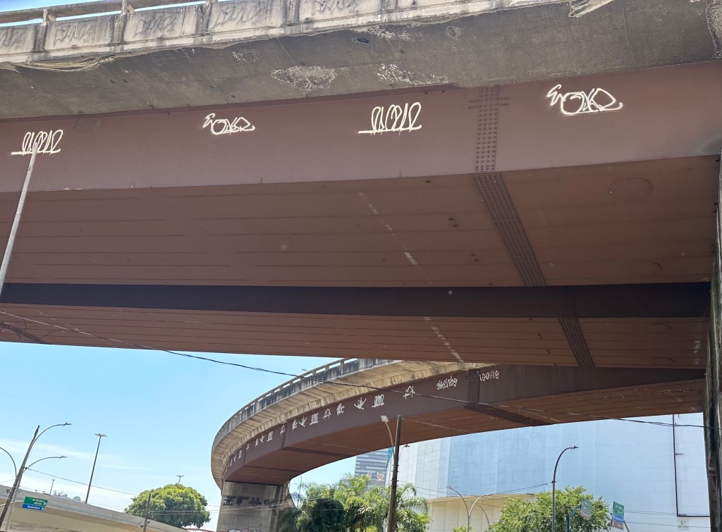 In the meantime, one last mystery we continue to puzzle over are the distinctive pictograph-like graffiti we saw on buildings, bridges and freeway overpasses up the entire coast. Doris repeatedly asked local guides whether the style and shapes meant something specific; she never got an explanation.