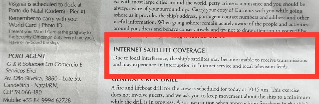Then came the ATM closure. “While Insignia is visiting Brazil and sailing in territorial waters, we are not permitted to operate the ATM on board,” our daily newsletter reported. “We apologize for the inconvenience.”