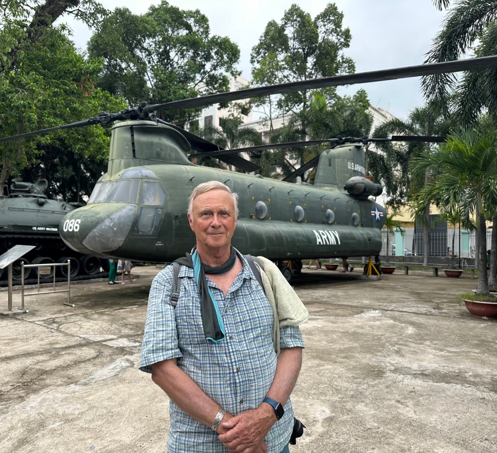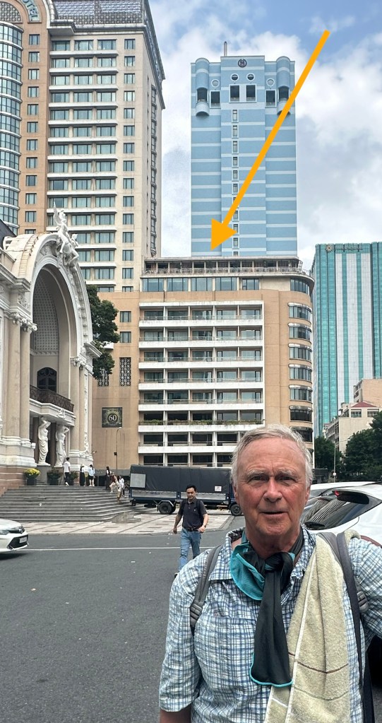 Among the locations was the former US personnel residence at 22 Gia Long Street made famous for its rooftop evacuation of people who reached it by ladder. Louis’s guide found an image online to help set up a photo of the building (yellow, right). Today, 22 Gia Long Street is an apartment building. Before covid, Louis would have sipped coffee in its rooftop coffee house the guide said anyone could enter until the pandemic ended its long life.