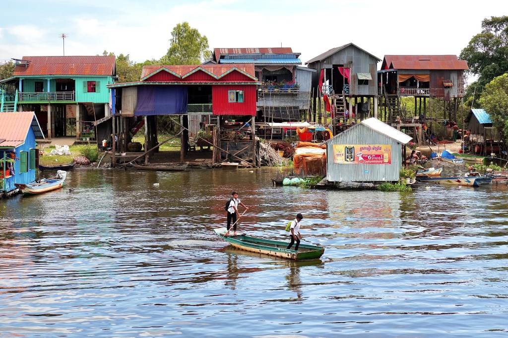 Tonle Sap is the largest permanent freshwater lake in Southeast Asia and water’s version of a metropolis. An estimated 80,000 people dwell in more than 170 floating villages on the lake, often complete with floating markets, schools, temples and basic services. To survive the ups and downs of the water level, some of the homes float on barrels, others stand on stilts.