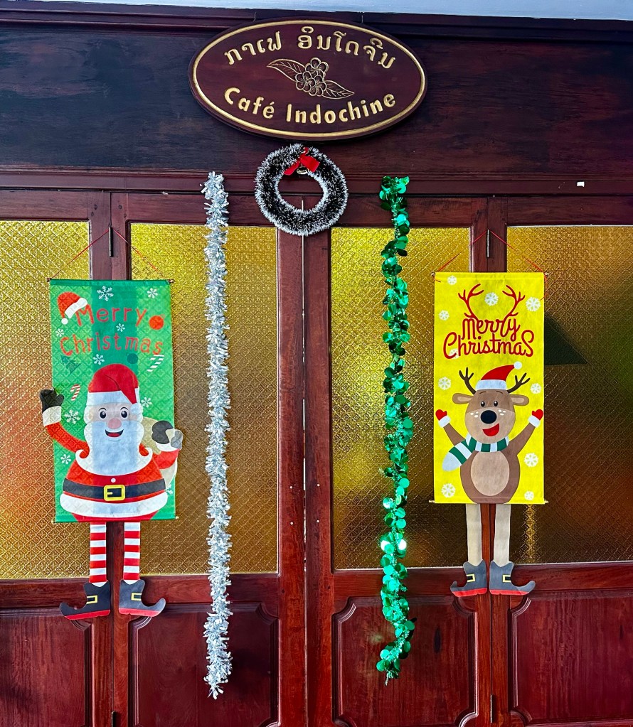 Exhibit B: Santa and Rudolph greet diners at a restaurant where employees wear reindeer antlers in Laos’s capital city.